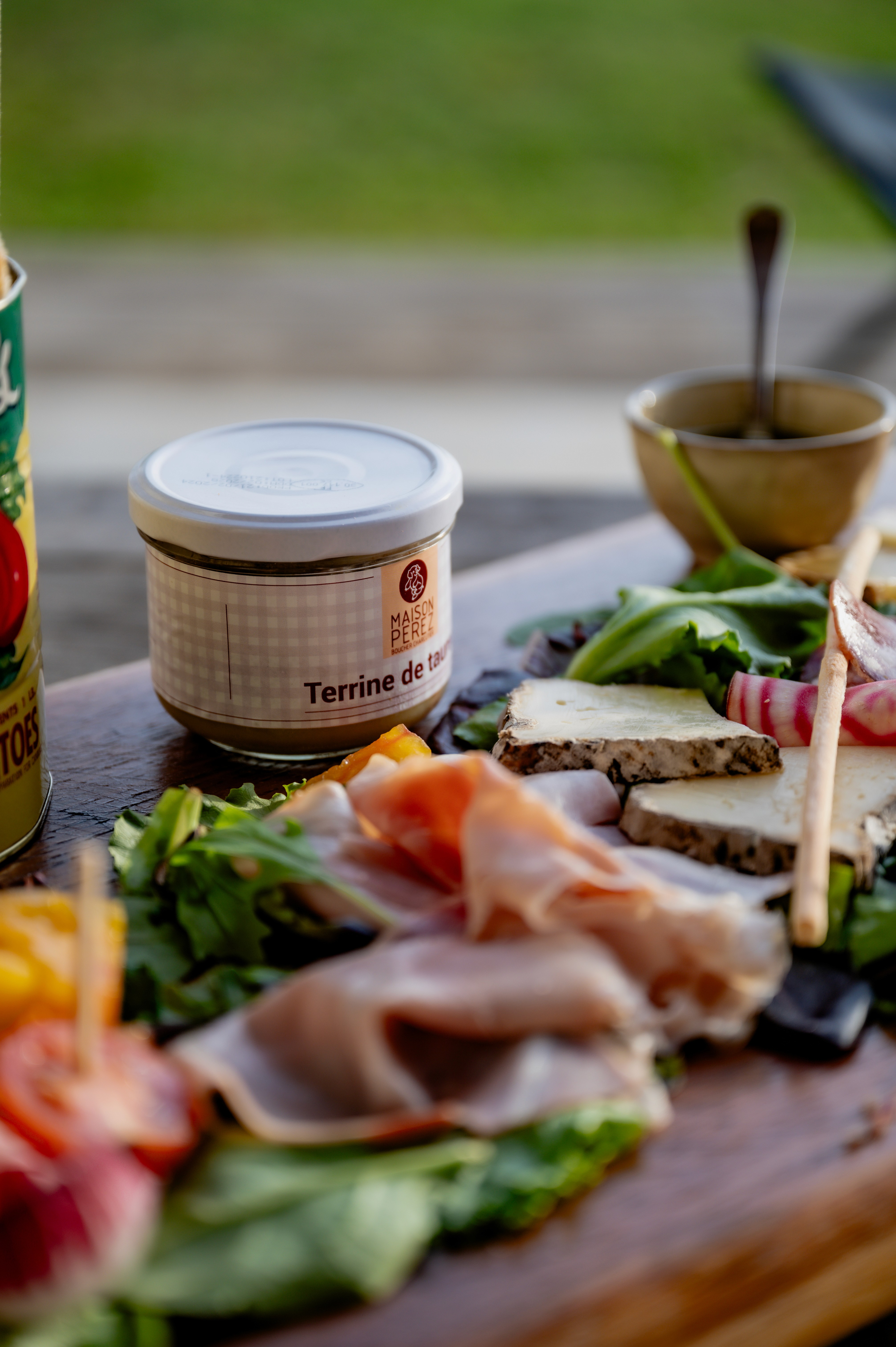 Terrine de taureau de Camargue 170 g OU jambon Pata Negra pur Bellota ibérique 60 g, Saucisson artisan fumé à l'ancienne, Saucisson artisan de taureau de Camargue, Jambon blanc fumé, Fromage de brebis, Tomme de Savoie, Cantal jeune, Brie de Meaux.